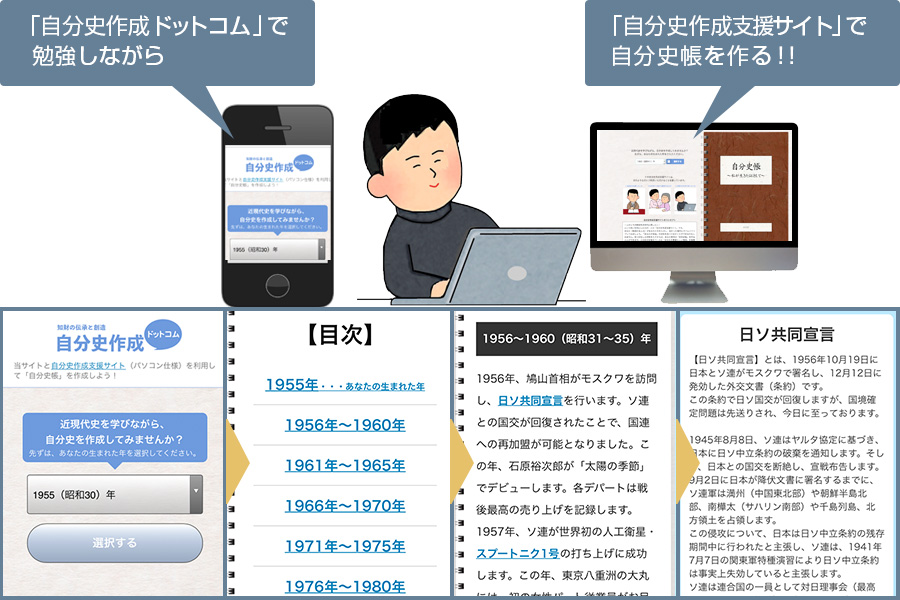 スマホでこのサイトを見ながら自分史作成支援サイトを利用すれば、歴史を学びながら自分史帳を作成する事ができます。
