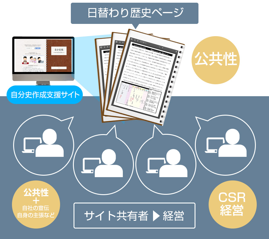 そのためには、自分史作成支援サイトの日替歴史頁のオーナーになっていただき、自分史作成支援サイトを共有していただきたいのです。公共的な日替歴史頁を作成することで「CSR(企業の社会的責任)経営」を目指そうとお考えの仲間たちと、自分史作成支援サイトを運営していけることを願っております。何卒ご協力をお願します。